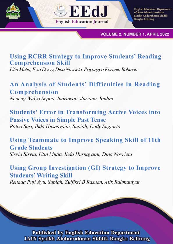 Vol. 4 No. 1 (2024)EEdJ: English Education Journal Vol. 4, No. 1 (April 2024) online ISSN: 2807-2065 by the theme "The Study of English Education in Disruption Era" covered articles about English education. In this issue, there are several writers from different institutions, various research view, and various titles: 1) Students' Perception towards the Use of Group Work Activity in Learning English at SMPN 1 Jebus; 2) The Correlation between Students' Vocabulary Achievement and Their Speaking Ability of the Twelfth Grade at MA Al-Islam Kemuja; 3) The Strategies used by English Teachers in Teaching Speaking at MTs Nurul Falah Air Mesu Timur; 4) Race and Prejudice: Constructing Identity in “The Help” Movie; 5) Pictionary Game in Promoting Students' Speaking Proficiency.