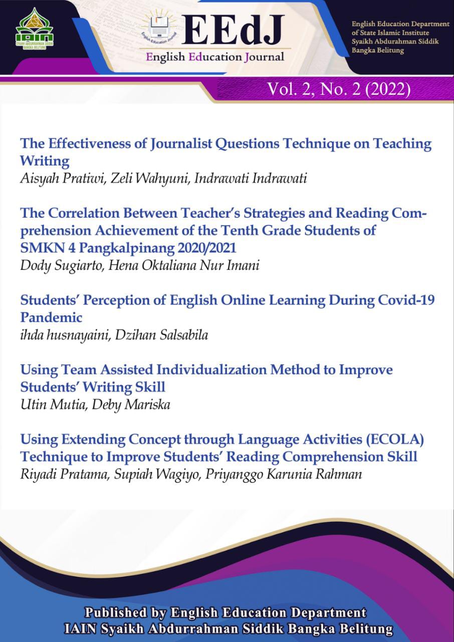 Vol. 3 No. 2 (2023)EEdJ: English Education Journal Vol. 3, No. 2 (October 2023) online ISSN: 2807-2065 by the theme "The Study of English Education in Disruption Era" covered articles about English education. In this issue, there are several writers from different institutions, various research view, and various titles: 1) The Correlation between Students’ Grammar Mastery and Their Writing Ability in Descriptive Text; 2) The Effect of Greeting Card Media on Students’ Writing Skill; 3) The Correlation between Students’ Achievement in Using Adjectives and Their Ability in Writing Descriptive Text; 4) The Correlation Between Students’ Self-Esteem and Their Writing Ability; 5) Applying Peer Review to Improve Students’ Descriptive Writing Text.