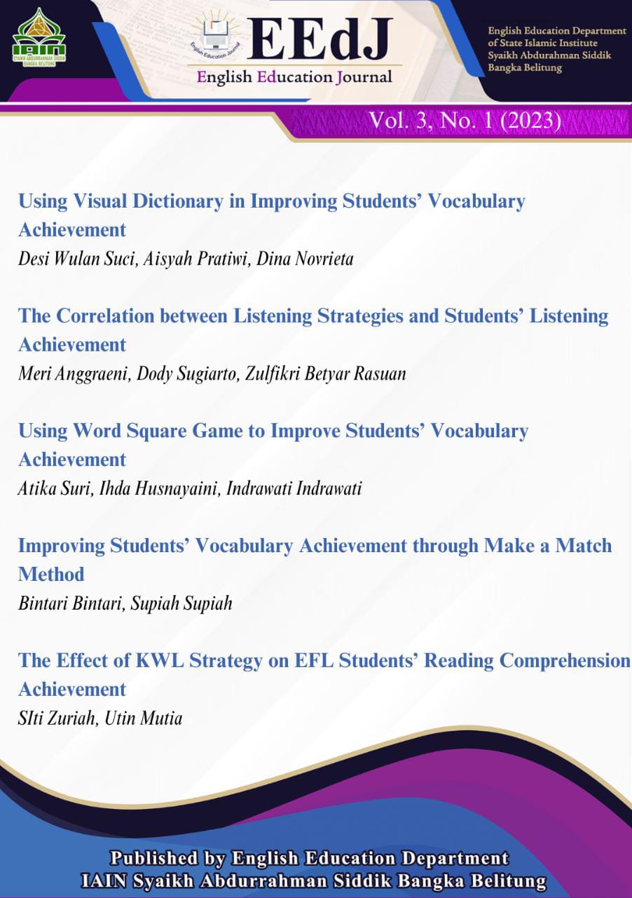 Vol. 3 No. 1 (2023)This volume consists of: 1) Using Visual Dictionary in Improving Students’ Vocabulary Achievement; 2) The Correlation between Listening Strategy and Students’ Listening Achievement; 3) Using Word Square Game to Improve Students’ Vocabulary Achievement; 4) Improving Students’ Vocabulary Achievement through Make a Match Method; 5) The Effect of KWL Strategy on EFL Students’ Reading Comprehension Achievement.