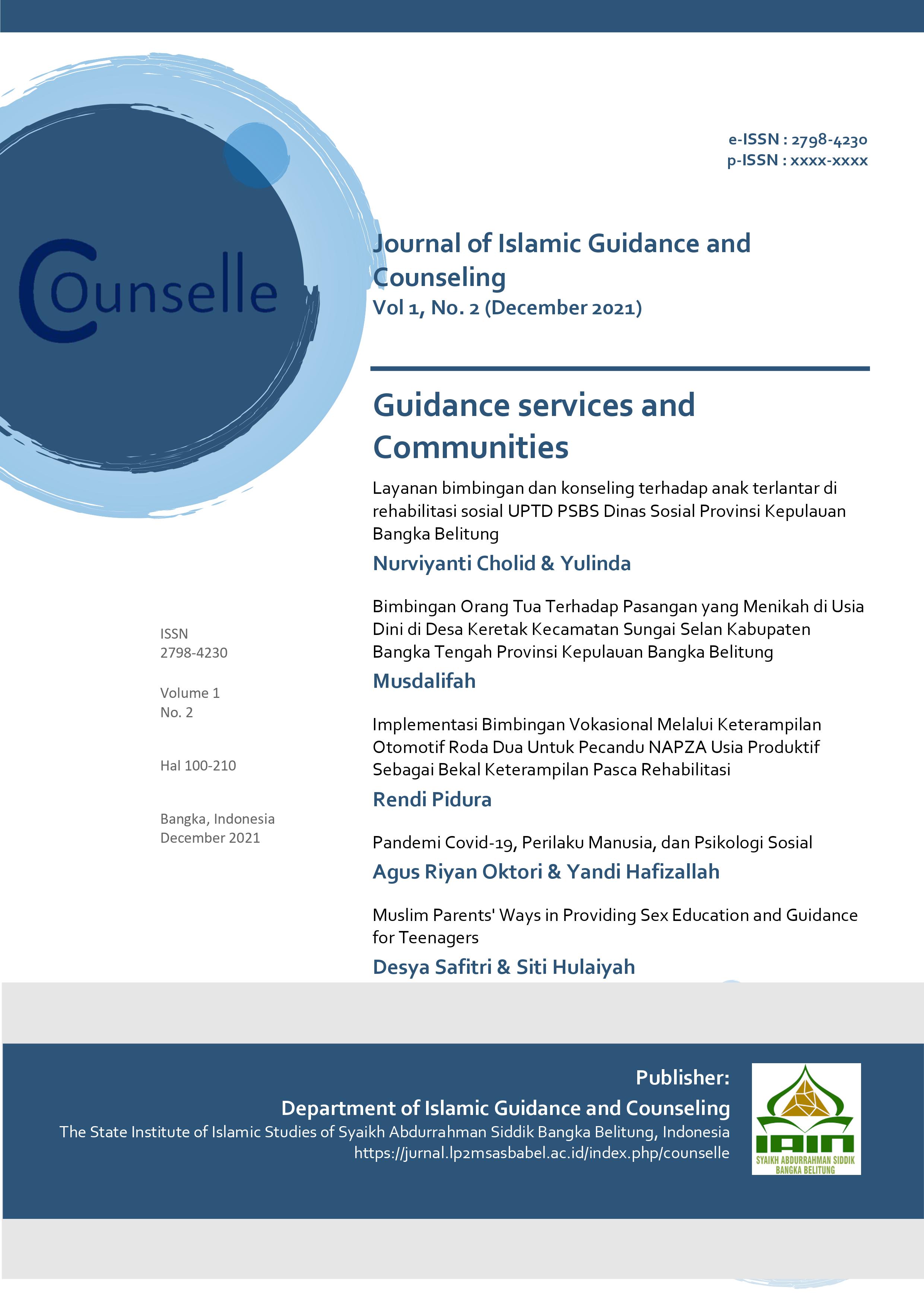 Counselle : Journal of Islamic Guidance and Counseling Vol. 1, No. 2, December 2021 by the theme “Guidance services and Communities” covered articles about guidance techniques in society which consists of 1) Layanan bimbingan dan konseling terhadap anak terlantar di rehabilitasi sosial UPTD PSBS Dinas Sosial Provinsi Kepulauan Bangka; 2) Implementasi Bimbingan Vokasional Melalui Keterampilan Otomotif Roda Dua Untuk Pecandu NAPZA Usia Produktif Sebagai Bekal Keterampilan Pasca Rehabilitasi; 3) Bimbingan Orang Tua Terhadap Pasangan yang Menikah di Usia Dini di Desa Keretak Kecamatan Sungai Selan Kabupaten Bangka Tengah Provinsi Kepulauan Bangka Belitung; 4) Pandemi Covid-19, Perilaku Manusia, dan Psikologi Sosial; 5) Muslim Parents' Ways in Providing Sex Education and Guidance for Teenagers.