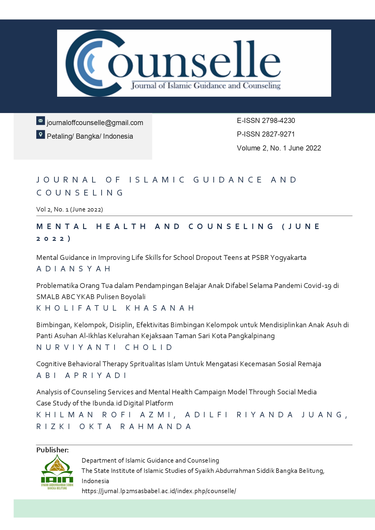 Counselle : Journal of Islamic Guidance and Counseling Vol. 2, No. 1, June 2022 by the theme “Mental Health and Counseling” covered articles about guidance techniques in society which consists of; 1] Mental Guidance in Improving Life Skills for School Dropout Teens at PSBR Yogyakarta; 2] Problematika Orang Tua dalam Pendampingan Belajar Anak Difabel Selama Pandemi Covid-19 di SMALB ABC YKAB Pulisen Boyolali; 3] Bimbingan, Kelompok, Disiplin, A Efektivitas Bimbingan Kelompok Untuk Mendisiplinkan Anak Asuh di Panti Asuhan Al-Ikhlas Kelurahan Kejaksaan Taman Sari Kota Pangkalpinang; 4] Cognitive Behavioral Therapy Spritualitas Islam Untuk Mengatasi Kecemasan Sosial Remaja; 5] Analysis of Counseling Services and Mental Health Campaign Model Through Social Media.