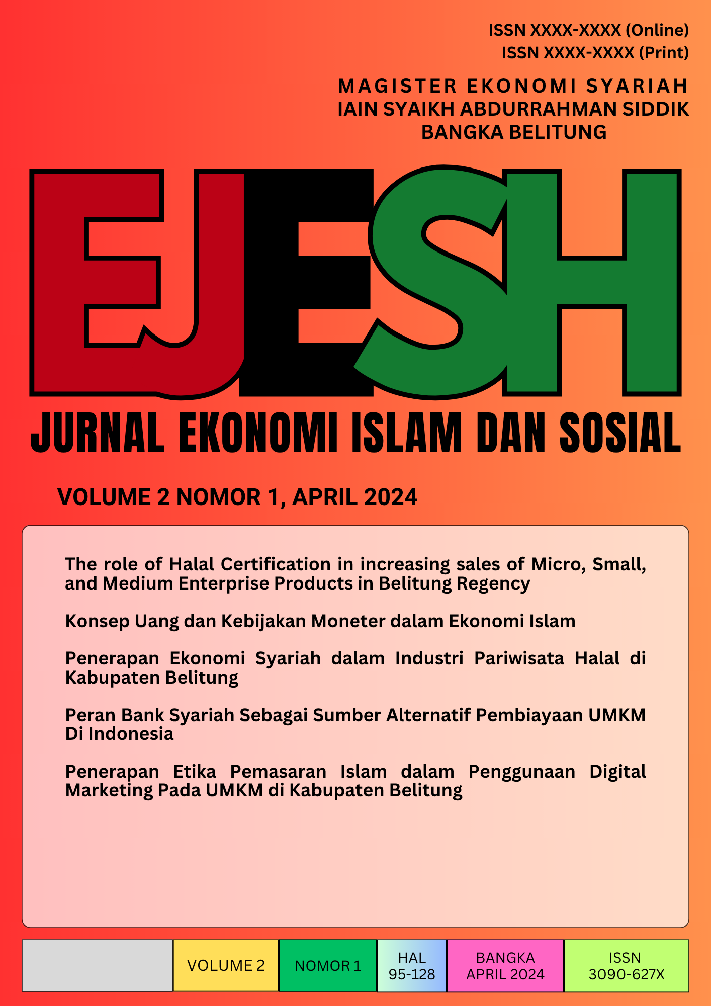 Vol. 2 No. 1 (2024)In this initial issues, we provide the following articles: 1. The role of Halal Certification in increasing sales of Micro, Small, and Medium Enterprise Products in Belitung Regency 2. Konsep Uang dan Kebijakan Moneter dalam Ekonomi Islam 3. Penerapan Ekonomi Syariah dalam Industri Pariwisata Halal di Kabupaten Belitung 4. Peran Bank Syariah Sebagai Sumber Alternatif Pembiayaan UMKM Di Indonesia 5. Penerapan Etika Pemasaran Islam dalam Penggunaan Digital Marketing Pada UMKM di Kabupaten Belitung