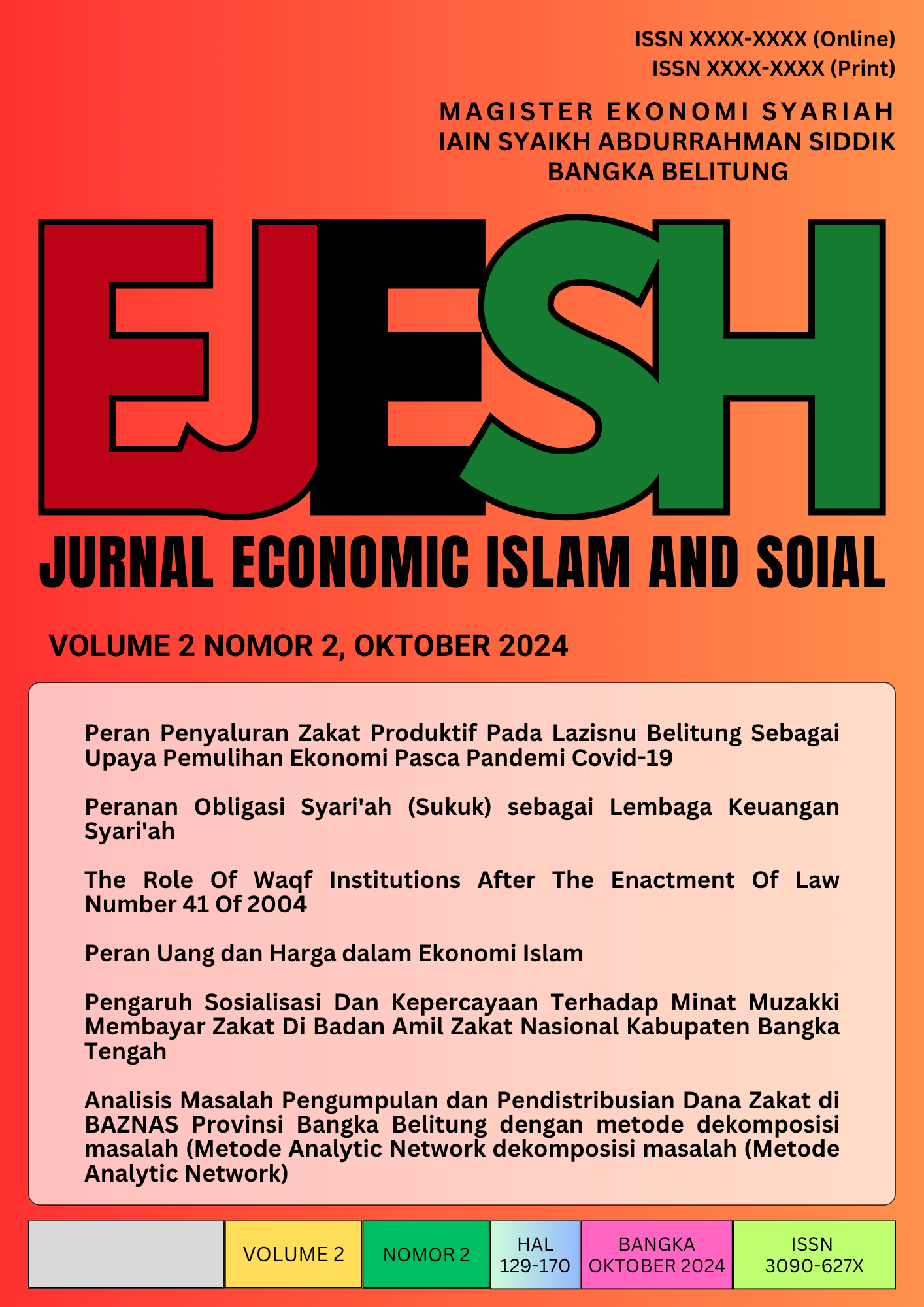 Vol. 2 No. 2 (2024)In this initial issues, we provide the following articles: 1. Peran Penyaluran Zakat Produktif Pada Lazisnu Belitung Sebagai Upaya Pemulihan Ekonomi Pasca Pandemi Covid-19 2. Peranan Obligasi Syari'ah (Sukuk) sebagai Lembaga Keuangan Syari'ah 3. The Role Of Waqf Institutions After The Enactment Of Law Number 41 Of 2004 4. Peran Uang dan Harga dalam Ekonomi Islam 5. Pengaruh Sosialisasi Dan Kepercayaan Terhadap Minat Muzakki Membayar Zakat Di Badan Amil Zakat Nasional Kabupaten Bangka Tengah 6. Analisis Masalah Pengumpulan dan Pendistribusian Dana Zakat di BAZNAS Provinsi Bangka Belitung dengan metode dekomposisi masalah (Metode Analytic Network dekomposisi masalah (Metode Analytic Network