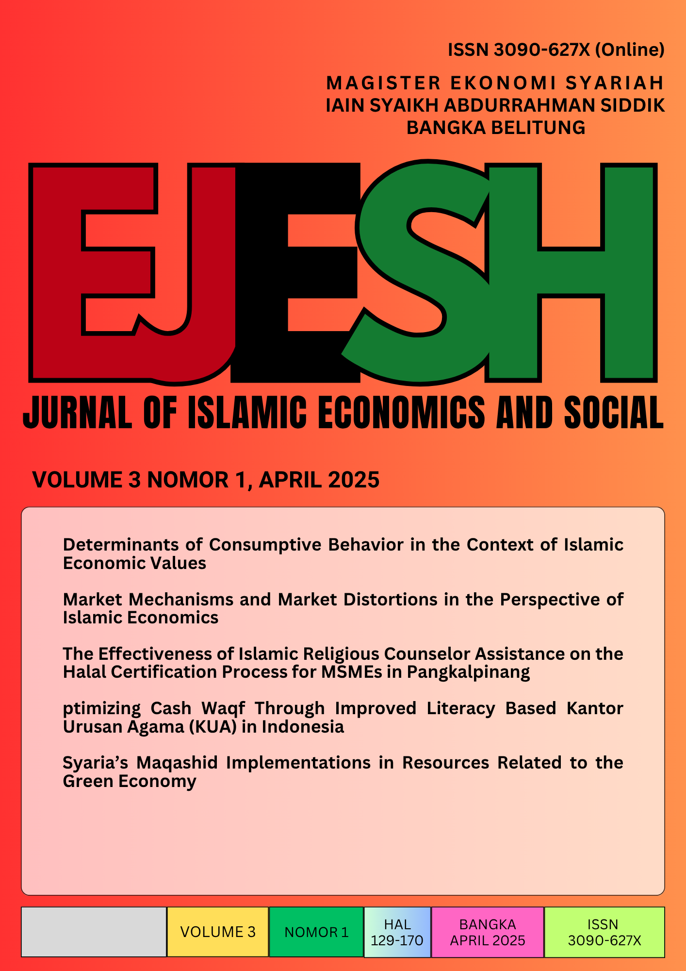 Vol. 3 No. 1 (2025)In this initial issues, we provide the following articles: 1. Determinants of Consumptive Behavior in the Context of Islamic Economic Values 2. Market Mechanisms and Market Distortions in the Perspective of Islamic Economics 3. The Effectiveness of Islamic Religious Counselor Assistance on the Halal Certification Process for MSMEs in Pangkalpinang 4. Optimizing Cash Waqf Through Improved Literacy Based Kantor Urusan Agama (KUA) in Indonesia 5. Syaria’s Maqashid Implementations in Resources Related to the Green Economy