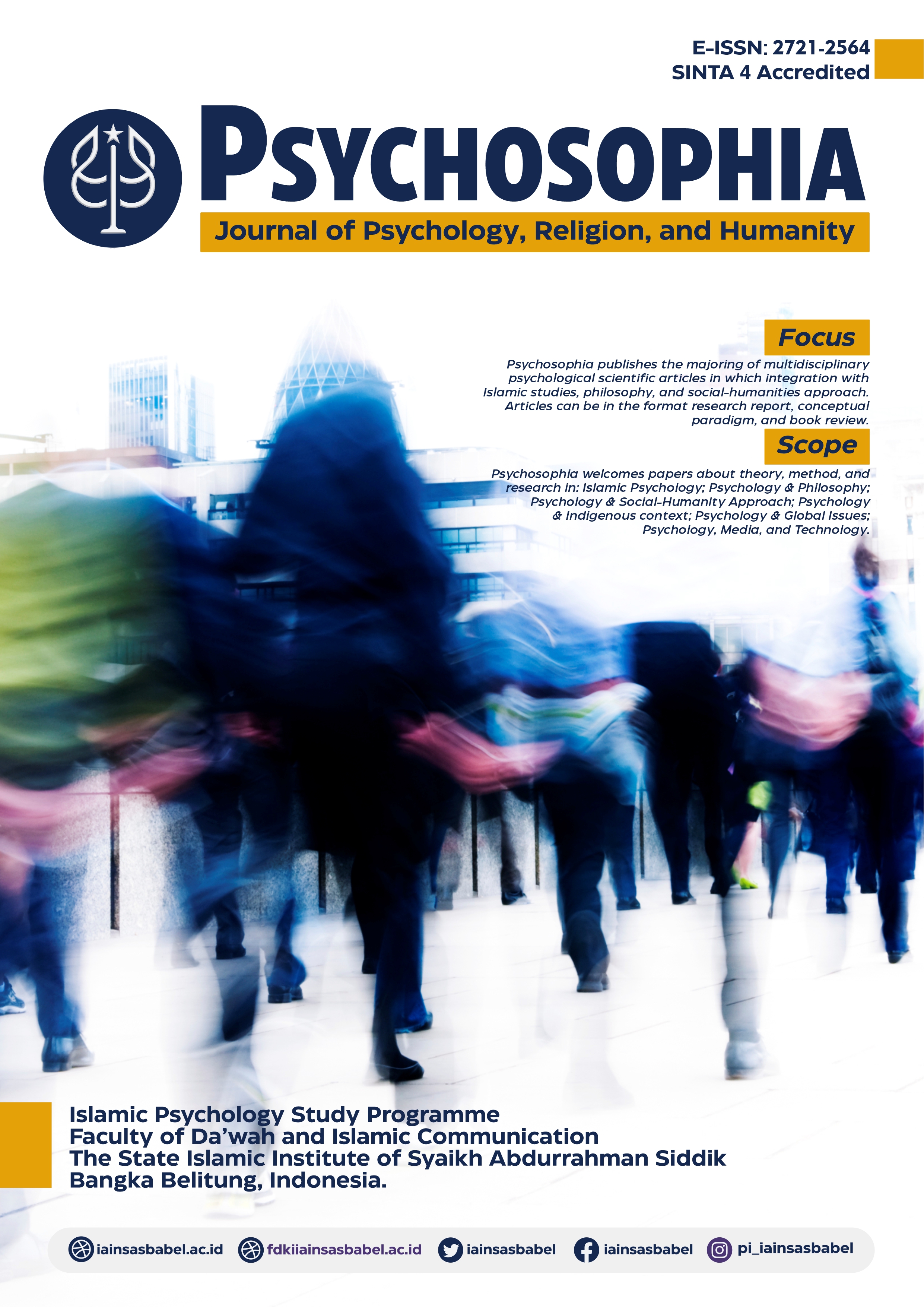 Pyschosophia: Journal of Psychology, Religion, and Humanity (online ISSN: 2721-2564), in publication since 2019. Psychosophia publishes a majoring of multilevel interdisciplinary psychological scientific articles that integrate Islamic studies, philosophy, and social-humanities approaches. Psychosophia: Journal of Psychology, Religion, and Humanity welcomes papers about theory, method, and research in Islamic Psychology, Psychology & Philosophy, Psychology & Social-Humanity Approach, Psychology & Indigenous Context, Psychology & Global Issues, and Psychology, Media, and Technology. Articles can be in the format of research report, a theoretical framework, or a book review. Pyschosophia: Journal of Psychology, Religion, and Humanity is a peer-reviewed journal published twice a year.