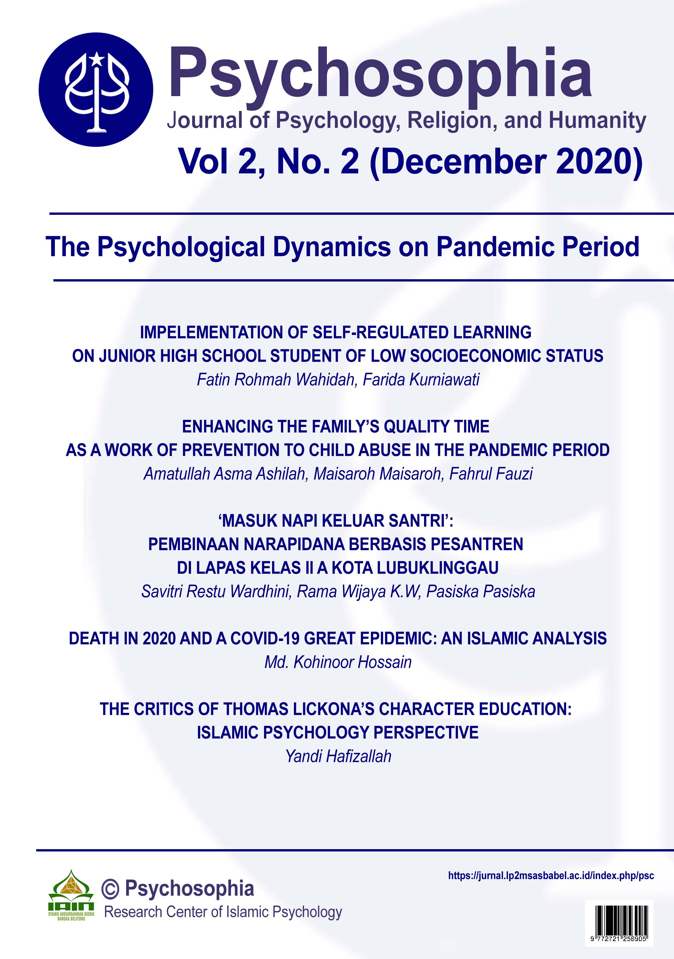 Vol. 2 No. 2 (2020)In this pandemic era, change in human behavior is the strongest basis for slowing the spread of the ongoing pandemic. In addition, disruptive change also demands the need for adaptation in various layers of life. Psychosophia Vol. 2, No. 2 (December 2020) presents two articles related to the psychological effects of the Covid-19 pandemic. Other papers address psychological issues in prison and the implementation of self-regulated learning of student's low socioeconomic status. The next paper discusses character education in the Islamic Psychology view. Therefore, in this issue, we have entitled "The Psychological Dynamics on Pandemic Period."